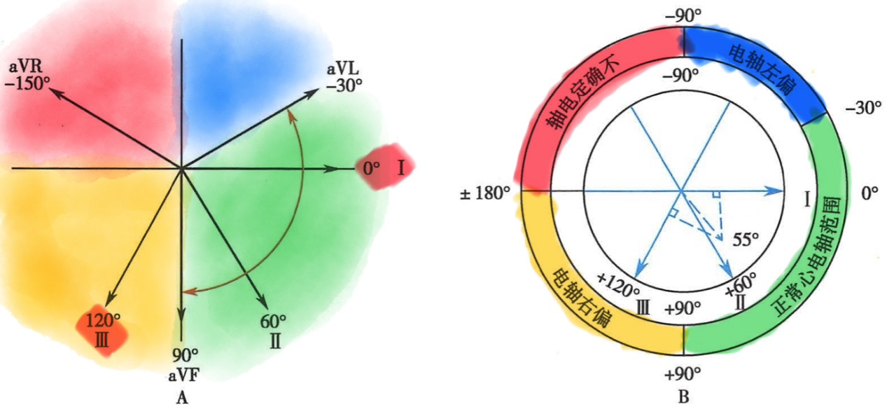 A.标准导联的导联轴;B.加压肢体导联的导联轴;C.肢体导联额面六轴系统
