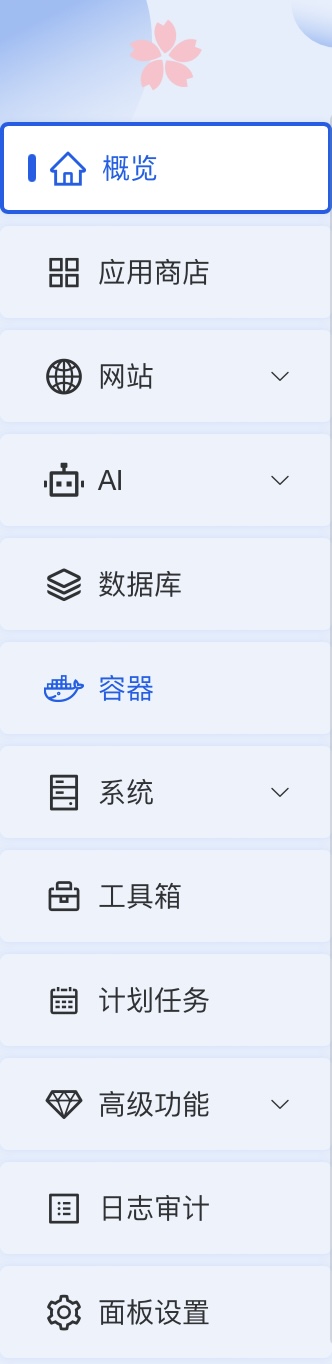 输入账号密码后,进入面板。左侧从上往下数,第二个应用商店,第三个网站,第五个数据库,第六个容器,第七个文件。在本教程中,会使用到这几个功能页面,提前熟悉并了解