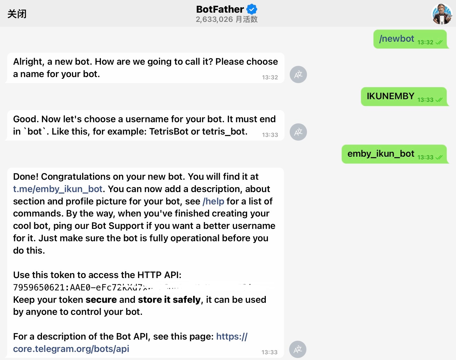 去https://t.me/BotFather输入/newbot,起一个合适的名字与用户名,复制如图所示Token,备用