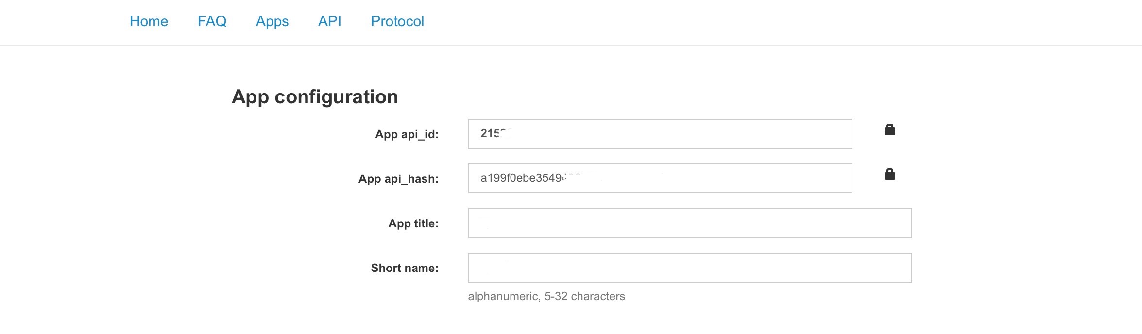 3.点击创建应用提交表格后,如果成功你将获得一个 "App api_id" 和 "App api_hash"。这就是你的API和Hash,复制备用。如图