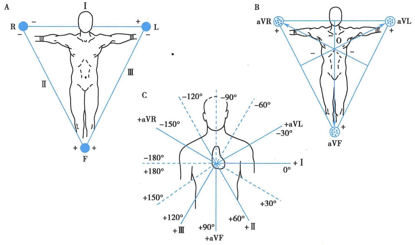 A.标准导联的导联轴;B.加压肢体导联的导联轴;C.肢体导联额面六轴系统
